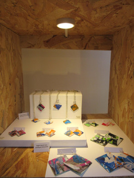 J'y ai déposé, pour l'instant, des tableaux (peinture + broderie), ainsi que des bijoux et des noeuds-papillons en sacs plastique réinventés et apprêts argent 925.